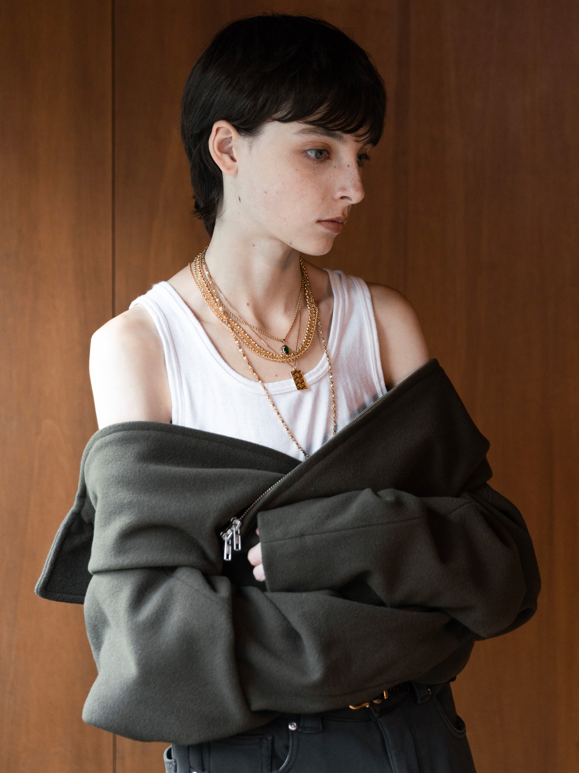 フロントのダブルジップに加え、袖口にもジップを配し、開閉によってシルエットの強弱をつけられる仕様を採用しています。